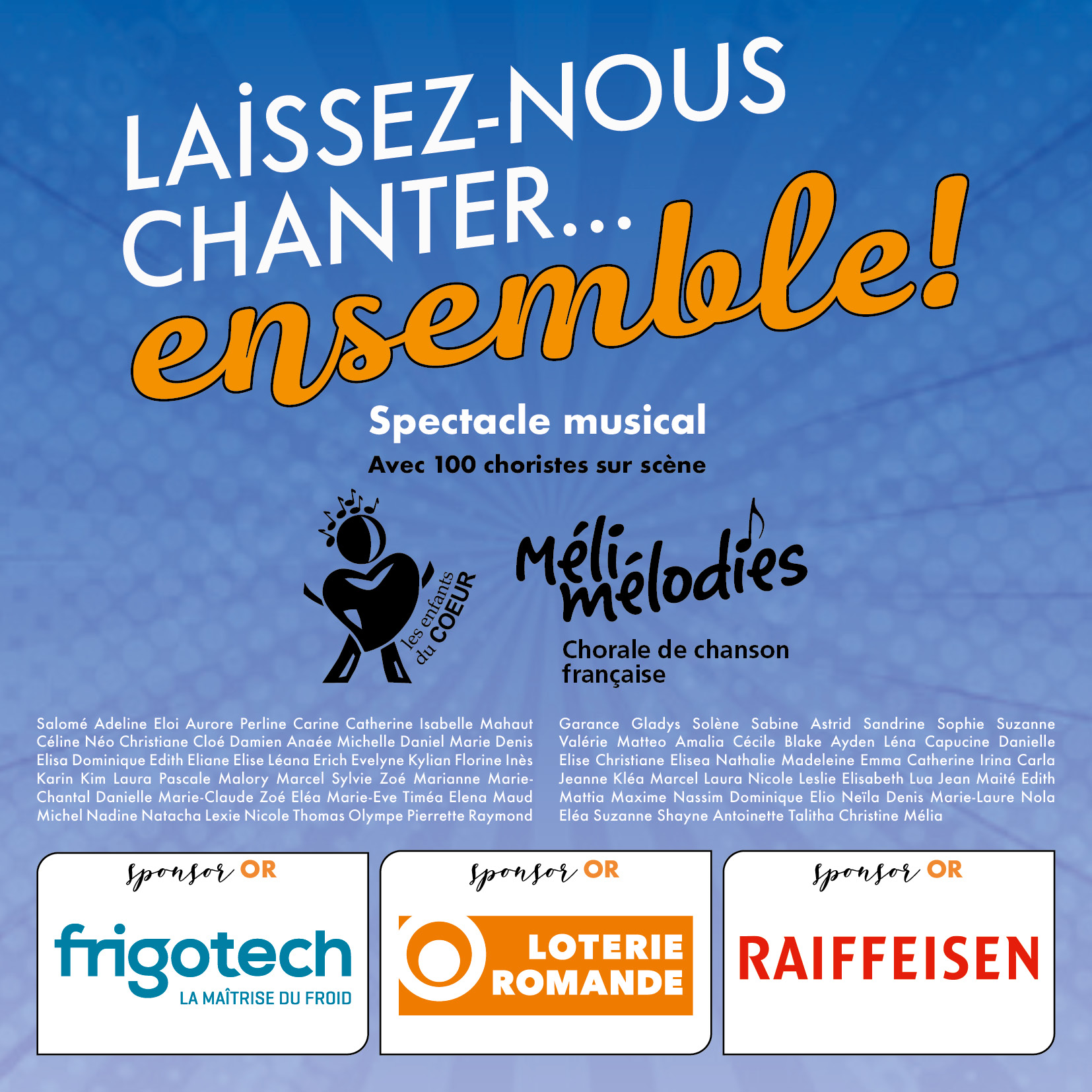Les jeunes voix pleines d’élan des Enfants du Cœur s’associent aux chanteurs de la chorale Méli-mélodies pour un spectacle musical unique, placé sous le signe du partage, de l’émotion et de la rencontre entre générations.